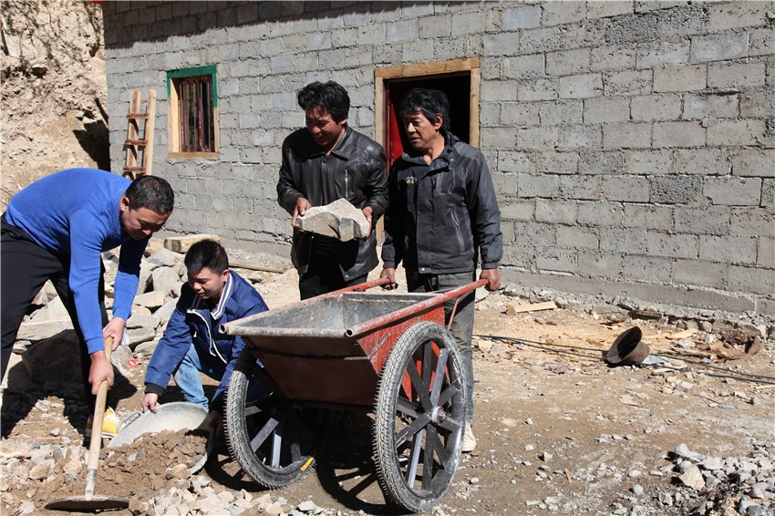 俗話說(shuō),一方水土養(yǎng)一方人,當(dāng)一方水土不能養(yǎng)活一方人時(shí),移民搬遷就成了最好選擇。這個(gè)行動(dòng)遲緩的中年男子名叫洛絨,今年48歲。他眼前的這幢建筑面積100平方米的磚混結(jié)構(gòu)單層房子,盡管室內(nèi)地面還沒(méi)灌注水泥,房?jī)?nèi)還沒(méi)裝修,但他對(duì)即將入住新房的那份喜悅一覽無(wú)余:“你看,這房子的前面是河、后面是山,太陽(yáng)一出來(lái)就能照著,住起來(lái)肯定舒服;這三間房子就有四個(gè)大窗戶(hù),光線照得進(jìn)來(lái),里面肯定亮堂;這一進(jìn)門(mén)就是客廳,兩邊各有一套大大的房間,裝修好后只要把家具家電一擺上,肯定漂亮;……”正當(dāng)他說(shuō)得津津有味時(shí),鄉(xiāng)上負(fù)責(zé)易地扶貧搬遷干部馬煜和包村干部鄭剛突然出現(xiàn)了他的眼前,他滿(mǎn)是感激地說(shuō):“其實(shí),我知道你們都很忙,用不著隔三差五過(guò)來(lái)幫我,我保證十天之內(nèi)就把地面填平。況且再過(guò)幾天,我愛(ài)人就從山上挖蟲(chóng)草回來(lái)了。有她打下手,兩個(gè)月內(nèi)我們一家人肯定就能住進(jìn)新房子啦!”