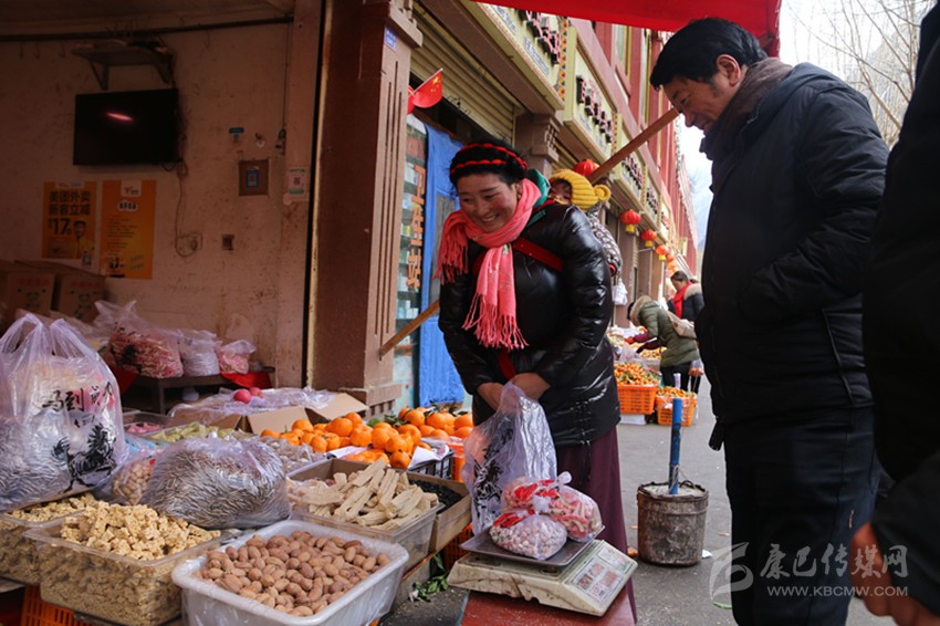 在離李全的鋪面十幾米的地方,副食商販王大姐正忙著給顧客羅繼祥稱雞蛋,羅繼祥是“老康定人”,他說:“以前過年都是自己在家里炒花生、炸果子,現(xiàn)在市場(chǎng)上啥子都有,方便多了,出門就能夠買到,到市場(chǎng)上和大家一起購(gòu)年貨,熱鬧、喜慶,有年味兒?!?/p>