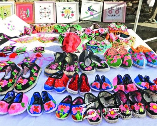 嵐安刺繡是瀘定的民族特色刺繡產(chǎn)品,是傳統(tǒng)民族純手工藝品,由于繡品一直被當(dāng)?shù)厝罕娮援a(chǎn)自用,一直沒有走向市場(chǎng),為幫助嵐安鄉(xiāng)傳承傳統(tǒng)文化,讓?shí)拱泊汤C找到銷路,取得經(jīng)濟(jì)收益,該縣婦聯(lián)利用舉辦第四屆紅櫻桃節(jié)的時(shí)機(jī),為刺繡產(chǎn)品牽線搭橋,將嵐安婦女刺繡作品納入到“三項(xiàng)建設(shè)促發(fā)展瀘定鄉(xiāng)村換新顏”成果展銷中,以提升刺繡作品的知名度。圖為參展的嵐安繡品。
