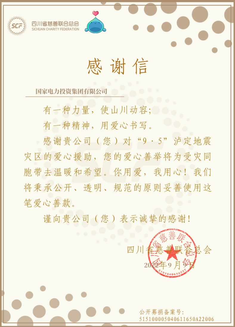2022年9月5日12時52分,瀘定6.8級地震發(fā)生后,國家電投集團(tuán)立刻向災(zāi)區(qū)捐款1000萬元,全力支援災(zāi)區(qū)救助和災(zāi)后重建,幫助災(zāi)區(qū)人民共渡難關(guān)。面對災(zāi)情,國家電投甘孜興川公司迅速啟動地震應(yīng)急響應(yīng),做好人員、設(shè)備詳細(xì)排查,防范塌方、泥石流等次生災(zāi)害,保持安全生產(chǎn)穩(wěn)定,千方百計保安全、保供電,充分發(fā)揮央企能源供應(yīng)“穩(wěn)定器”和“壓艙石”作用,助力災(zāi)區(qū)盡快恢復(fù)生產(chǎn)生活秩序。統(tǒng)籌調(diào)度各方力量,克服疫情和余震影響,緊急采購災(zāi)區(qū)急需的發(fā)電機、電筒等設(shè)備第一時間送達(dá)災(zāi)區(qū),支援應(yīng)急。在得知瀘定縣得妥鎮(zhèn)電力系統(tǒng)受災(zāi)嚴(yán)重急需救援力量后,公司迅速成立抗震救災(zāi)保供黨員先鋒隊,從正在緊張施工的興川實證光伏電站抽調(diào)精銳力量26人奔襲700公里,抵達(dá)瀘定縣得妥鎮(zhèn),緊急馳援地方搶險救災(zāi)工作,拆除100多戶危房電源,恢復(fù)2個行政村460戶村民安全用電,贏得當(dāng)?shù)卣蜕鐣鹘缫恢潞迷u。