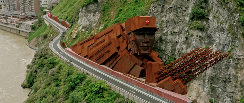 4月20日,大渡橋橫,春和景明。漫步于瀘定縣瀘橋鎮(zhèn)河?xùn)|片區(qū)的濱河廣場(chǎng),對(duì)岸河西片區(qū)的海子山下,“驚險(xiǎn)奇絕”的景觀墻映入眼簾。自南向北遠(yuǎn)眺,入目的是巨大的耐候鋼塑紅軍主題雕像群,由主雕“勇士魂”及“飛”“奪”兩組副雕構(gòu)成敘事動(dòng)線,重溫再現(xiàn)撼人心魄的恢弘歷史。