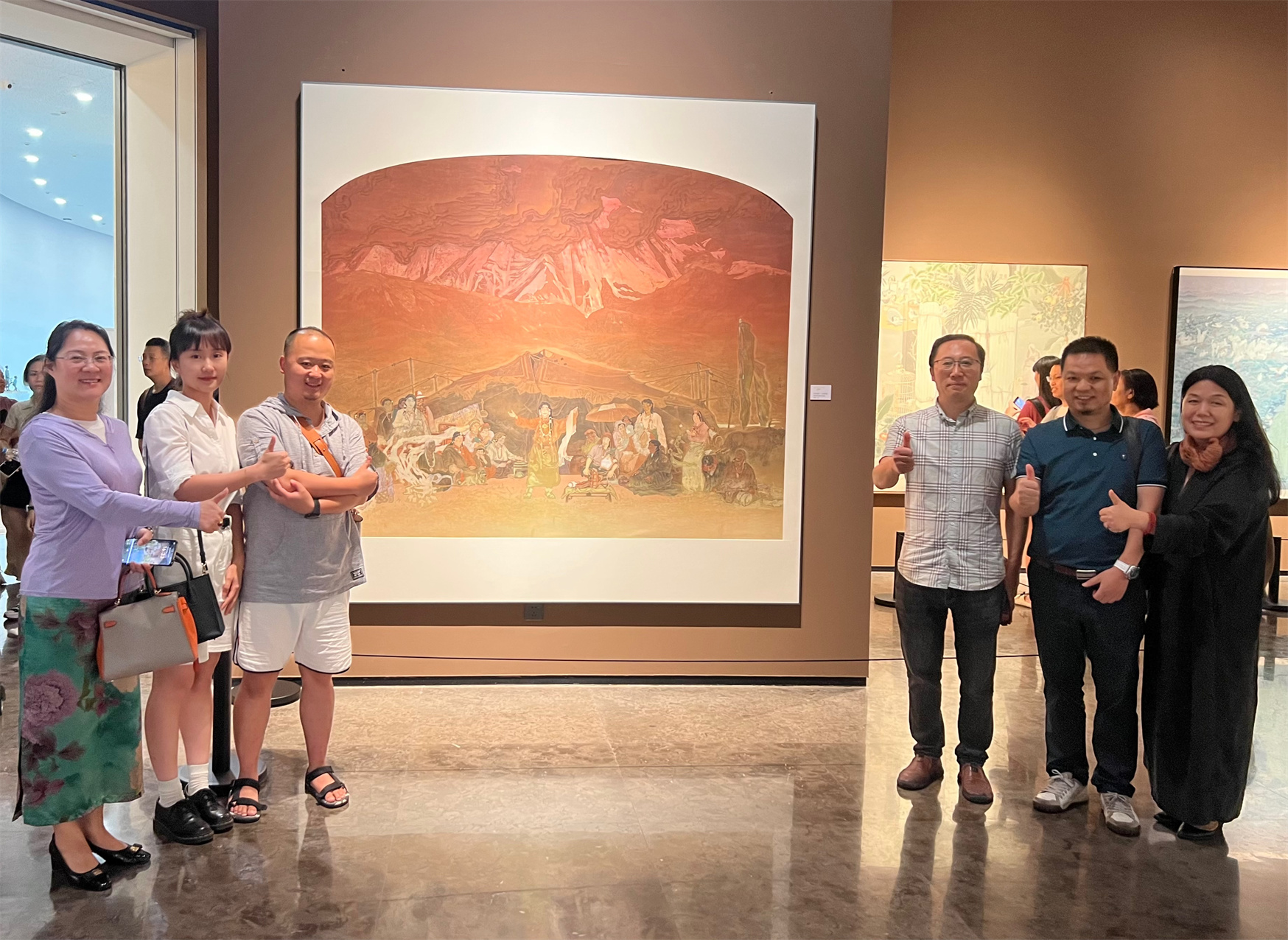 “這幅畫運(yùn)用了唐卡的技法和審美,首先,是色彩吸收了古代壁畫的配色;其次,人物造型在寫實(shí)基礎(chǔ)上增加了唐卡中的平面造型審美;再者,將傳統(tǒng)唐卡畫中的顏料、畫布和染法,與歷史題材的中國畫創(chuàng)作融合統(tǒng)一起來。這種淳樸、自然的和諧融合是我這十多年來一直探索的個(gè)人藝術(shù)風(fēng)格?!眲⒅铱〗榻B說,這幅畫中遠(yuǎn)景、中景、近景契合了天、地、人的喻義,人群、帳篷與大地構(gòu)筑了和諧相生的理想狀態(tài),展現(xiàn)出了民族民間文化的歷史縱深感和文化厚重感。