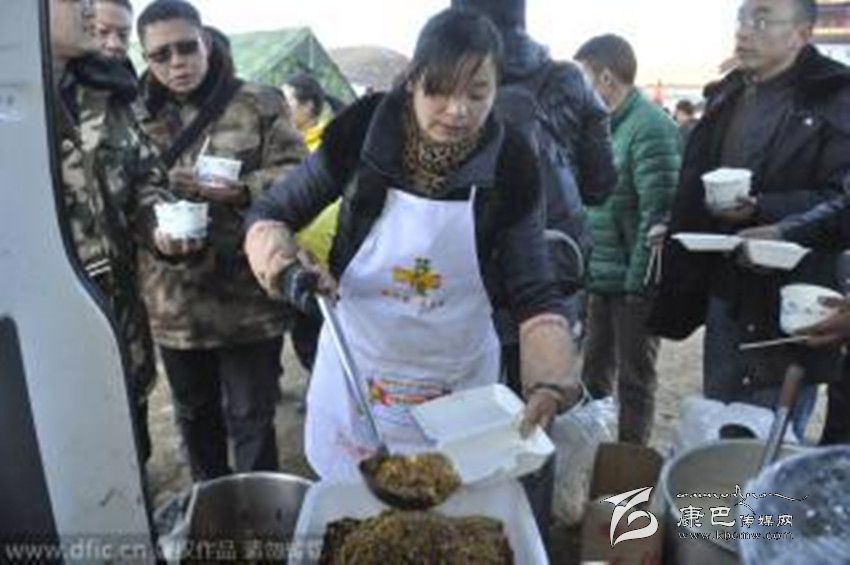 據(jù)了解,韓大哥是這家飯店的老板之一,他是仁壽縣人,幾年前和朋友來到新都橋開始經(jīng)營飯店??刀?.3級地震發(fā)生時,他人在成都。但看到災(zāi)情發(fā)生,韓大哥立即和飯店另外幾個合伙人決定到安置點免費送盒飯,“我在當(dāng)?shù)刈隽?、7年生意,現(xiàn)在出了事情,就應(yīng)該伸手支援嘛!”據(jù)韓大哥介紹,此次地震發(fā)生后,新都橋80%左右的飯店都已經(jīng)關(guān)門,他們的飯店因為還有一些接待工作,仍在正常營業(yè)。自11月23日晚上,他家的飯店就主動為塔公鎮(zhèn)的安置點免費派送盒飯,“包括中午和晚上兩頓,兩葷兩素一湯的配置。”因為太忙, 韓大哥來不及仔細統(tǒng)計,他大概知道每天送出的盒飯在1200盒到1500盒之間,每天送出盒飯的成本在4、5千左右。但在他看來,這些其實都算不上什么,“能為災(zāi)區(qū)出一份力,我們就很滿足了,我們打算一直送到抗震救災(zāi)工作結(jié)束,也就是直到災(zāi)民有條件自己做飯的時候。”“這邊天氣很冷,他們吃的一般是些面包、牛奶之類的干糧,我們就是想讓大家吃到熱飯、熱菜。”據(jù)韓大哥介紹,每天飯店都會派出3、4個人將盒飯運送到安置點,“只要有人需要我們都會分發(fā)盒飯,包括一些志愿者和武警官兵也吃我們的飯。