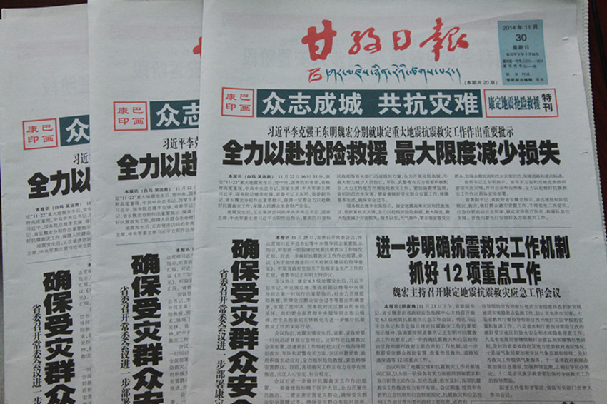 又訊 此外,自康定地震發(fā)生以來,本報(bào)藏漢文報(bào)廣大編采人員發(fā)揚(yáng)連續(xù)作戰(zhàn)的精神,已經(jīng)連續(xù)9天不分白天黑夜地工作,保證了一線有記者的身影,后方編輯及時(shí)發(fā)聲,截止30日,本報(bào)藏漢文報(bào)已經(jīng)出版13期《眾志成城 共抗災(zāi)難》??鸵黄谔乜?,共計(jì)72個(gè)版面;本報(bào)《康巴傳媒網(wǎng)》自開辦網(wǎng)站以來,首次實(shí)現(xiàn)了網(wǎng)站信息即時(shí)更新、滾動(dòng)發(fā)布,網(wǎng)站日上稿量超過100條,日點(diǎn)擊量均超過10萬人次;本報(bào)微信平臺(tái)則采用短平快的方式,第一時(shí)間發(fā)布最新資訊,引導(dǎo)公眾情緒,傳播黨委政府的聲音,微信日點(diǎn)擊和轉(zhuǎn)發(fā)量超過2萬人次;除此之外,本報(bào)承辦的手機(jī)報(bào)也發(fā)揮了巨大的作用。