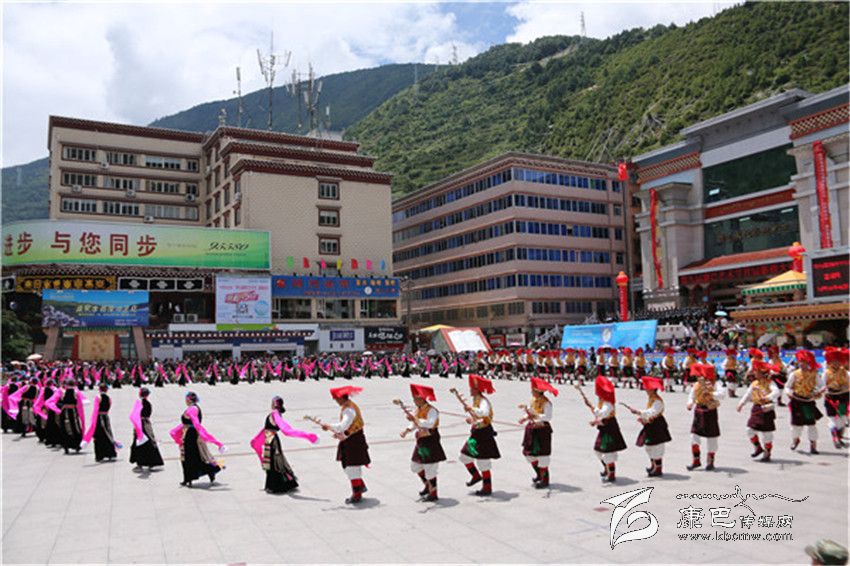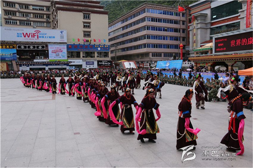 表演在巴塘縣舞之中拉開帷幕,上百名身著盛裝的男女演員用歡快的舞步、飄揚(yáng)的云袖向康定市民和四方來客展現(xiàn)了“弦子之鄉(xiāng)”的淳樸熱情和如畫風(fēng)光。演員們精彩、投入的表演贏得了現(xiàn)場(chǎng)觀眾的陣陣好評(píng)。分別表演完各自的縣舞之后,三縣人馬一同跳起了甘孜州州舞,在熟悉的《康定情歌》旋律之中,男男女女、老老少少300余人盡情舞蹈,時(shí)而大步流星、時(shí)而小心翼翼、時(shí)而熱情奔放、時(shí)而掩面含羞,黑白、紅黃、藍(lán)綠各色服裝隨著音樂節(jié)拍交相輝映,繪制成一幅團(tuán)結(jié)友愛的和諧圖景。