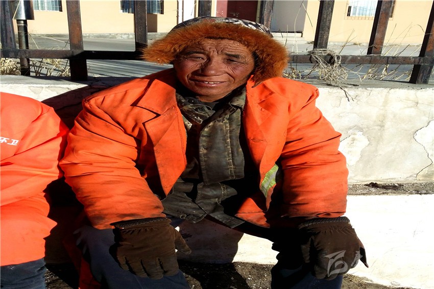 春節(jié)快到了,石渠的最低氣溫已低至零下20余攝氏度,在這呵氣成霜、滴水成冰的季節(jié),大街小巷卻仍然能看見(jiàn)身穿橙色工作服還在起早貪黑地辛勞工作著的人們,他們就是石渠的環(huán)衛(wèi)工人。年近60的澤仁羅布便是其中的一員,雖然他雙頰已被風(fēng)霜刻畫(huà)出道道溝壑,但身體卻很硬朗,閑暇的時(shí)候他喜歡和大家在工作的附近找一處陽(yáng)光充足的地方曬曬太陽(yáng)、聊聊天。