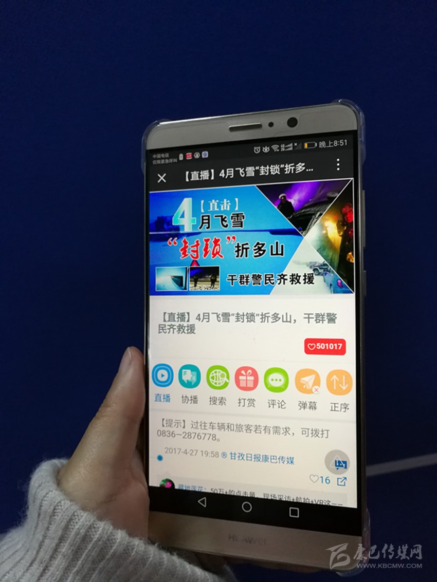 一路上,記者通過甘孜日報微信平臺,將救援情況和群眾的實況,第一時間進行了直播。隨著一條條現場圖片、文字和視頻的及時發(fā)布,人們第一時間得知了折多山受困車輛和群眾得到救助的實際情況,人們紛紛在直播平臺留言,為交通、路政和當地黨委、政府的救援行動點贊。在對折多山強降雪和受堵現場進行直播報道的同時,甘孜日報社還利用直播平臺,回顧了折多山道路交通難的歷史,并再次發(fā)布雅康高速修建、折多山隧道立項等重大交通建設工程的進展情況,又對此次折多山風雪阻斷道路交通,導致車輛和人群滯留的特殊原因進行了報道和澄清,并報道了風雪中仍有不少徒步游客繼續(xù)甘孜之旅的情況,第一時間讓更多的人了解到,飛雪并未對道路造成致命影響,甘孜州的道路交通狀況和應急處置能力已經得到了極大的提升,完全有能力保障人們出行以及生命、財產安全。