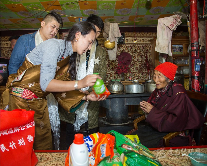 為了及時(shí)將物資送到群眾手中,公益小組一行當(dāng)日凌晨4點(diǎn)便從成都出發(fā),于下午1點(diǎn)到達(dá)走訪地石渠縣。隨后,公益小組不顧舟車(chē)勞頓,堅(jiān)持走訪了10戶此次“新牧民養(yǎng)成計(jì)劃”示范家庭,為他們送上了生活禮包及文明禮包,并送上了節(jié)日的祝福。年過(guò)七旬的卓嘎是本次“新牧民養(yǎng)成計(jì)劃”示范戶之一,體弱多病的她堅(jiān)持要迎接公益小組的到來(lái),并獻(xiàn)上哈達(dá)。收到物資后她激動(dòng)地說(shuō),兩年前華僑城來(lái)到石渠縣,為他們帶來(lái)了新棉被,那個(gè)冬天他們一點(diǎn)都不冷,現(xiàn)在又送來(lái)了糧食和生活用品,讓他們可以過(guò)上更好的生活。