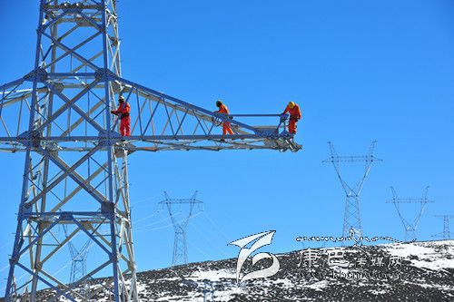 電力天路川藏聯(lián)網(wǎng)工程特別報(bào)道 11月中旬,寒風(fēng)凜冽,滴水成冰。為確保我州“電力天路”無電地區(qū)和農(nóng)網(wǎng)改造建設(shè)工程明年3月份按時(shí)完工 ,四川電力公司的各路建設(shè)者,依舊保持 著旺盛的工作斗志,吃住在各施工現(xiàn)場(chǎng),奮戰(zhàn)在高寒缺氧地域。圖為11月12日,電力員工奮戰(zhàn)在雅江縣境內(nèi)海拔 4412米的施工地段,登塔作業(yè)。 (楊林 攝影報(bào)道)