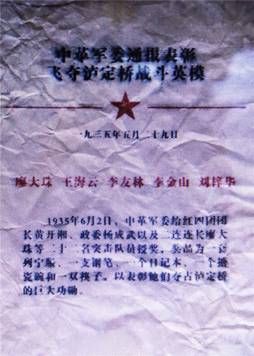 劉東升談起父親當年作為飛奪瀘定橋22勇士之一,心情無比激動?!案赣H當年如果不是努力爭取,就沒有后來的勇士稱號,更沒有中革軍委的嘉獎?!?935年5月,北上抗日的紅軍向天險大渡河挺進。大渡河水流湍急,兩岸都是高山峻嶺,只有一座鐵索橋可以通過。這座鐵索橋,就是紅軍北上必須奪取的瀘定橋。