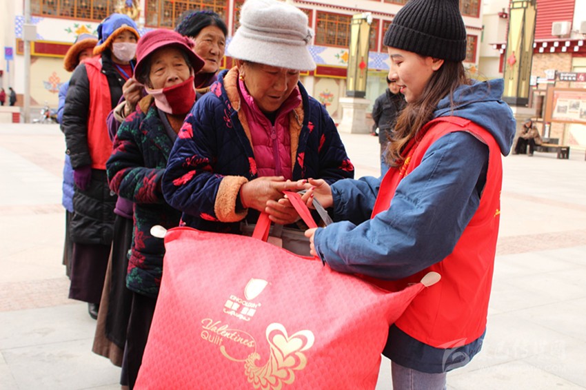 老人開(kāi)心地接過(guò)志愿者發(fā)放的棉被。