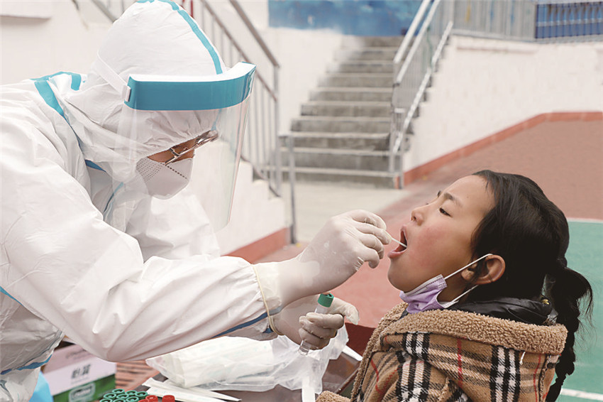 圖為醫(yī)護(hù)人員正在為學(xué)生做核酸檢測(cè)。
