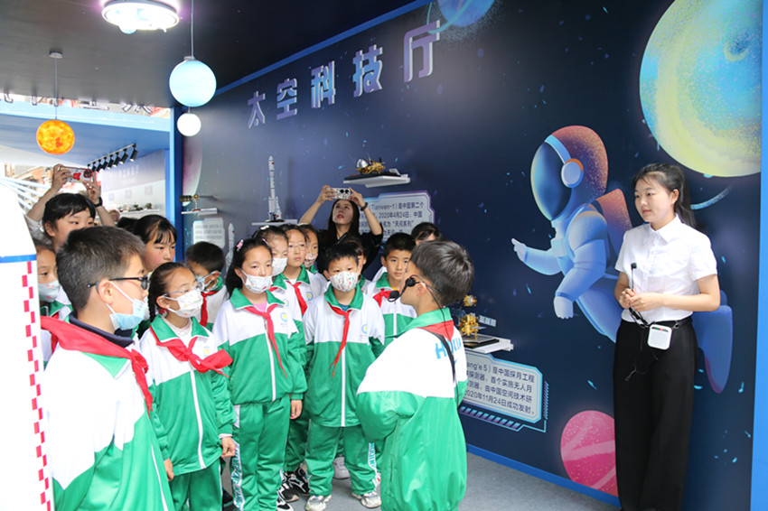 “航天夢(mèng)是中國(guó)夢(mèng)、華夏夢(mèng),神舟十六號(hào)載人飛船發(fā)射成功并進(jìn)入預(yù)定軌道。古人仰望星空,幻想上天攬?jiān)碌膲?mèng)想,在一代代中國(guó)航天人的努力下逐漸變?yōu)榱爽F(xiàn)實(shí)。”“紅領(lǐng)巾”講解員劉嘉沐在解說他負(fù)責(zé)的天空科技廳時(shí),將這一喜訊分享給了在場(chǎng)的同學(xué)們?!跋M芙枭裰凼?hào)載人飛船發(fā)射成功的機(jī)會(huì),在科普周活動(dòng)中普及航天知識(shí),讓更多的學(xué)生深入了解航天文化,引導(dǎo)青少年傳承航天精神、點(diǎn)燃航天夢(mèng)想?!敝菘茀f(xié)負(fù)責(zé)人告訴記者。