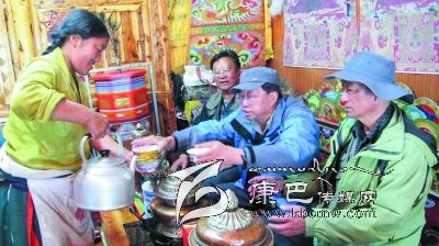 位于宗塔草原“大盆地”東邊山坡的降巴牧場在隊(duì)員們的心里也留下了深刻的印記。15日早上5點(diǎn)半隊(duì)員們就出發(fā)上了降巴牧場。朝霞映紅了天邊,紅云罩著青草牛糞味飄香的草坡。比采風(fēng)隊(duì)員們起得更早的牧人已擠完了牛奶,一個(gè)僅10 歲的女孩正在草坡上拾牛糞;牛毛帳篷里,勤勞的牧婦已打開了牛奶分離器開始分離酥油了……一問,方知牧民們今晨4點(diǎn)就起床勞作,干完早上的活兒,他們要趕到三公里遠(yuǎn)的“盆地”耍壩子,看賽馬。這個(gè)牧場靜謐潔凈得令人稱奇,青青的草坡上絕少有垃圾存留,沒見到一只兇惡的牧犬;按季節(jié)劃分的草場由整潔的網(wǎng)圍欄圈開,分隔有致;牧人舉家出門,連帳篷門也不掩,據(jù)說這里沒有偷盜發(fā)生,家人和諧;古老、平和的氣氛中,晨風(fēng)輕拂,野花青草搖曳,輕柔的晨霧中偶而傳來兩聲牛哞,讓人頓感心靜如水。對(duì)于長期居住城市的人來說,這里無疑是“幽雅天堂”了。