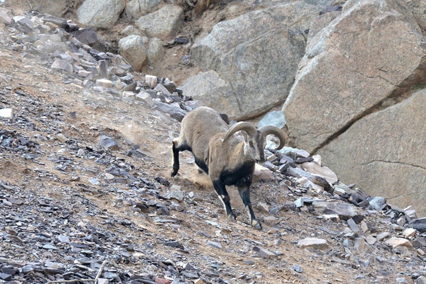 在回程的時候又看到一群巖羊,大約有20余只。這次與它們接近的距離僅有5、6米的地方。它們在隊員們的面前若無其事地吃草,只有一只母羊抬頭看了隊員們一會兒。和這只母羊如此近距離接近,以至于能看清它的眼神里似乎只有一些疑惑,卻沒有恐懼。