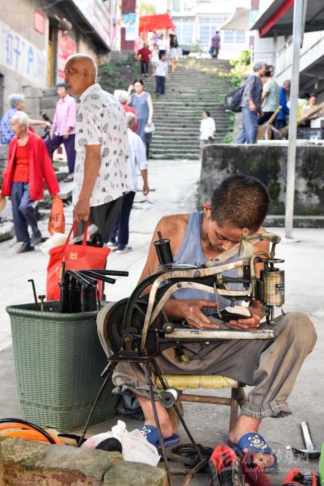 “三娃,今天來(lái)得早嘛!”尚未坐定,便有鄉(xiāng)鄰拿著鞋子走過(guò)來(lái),“鞋跟脫膠了,修一哈。”