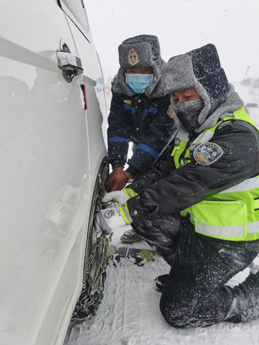 圖為錯(cuò)阿卡點(diǎn)民警幫助過(guò)往車輛安裝防滑鏈。
