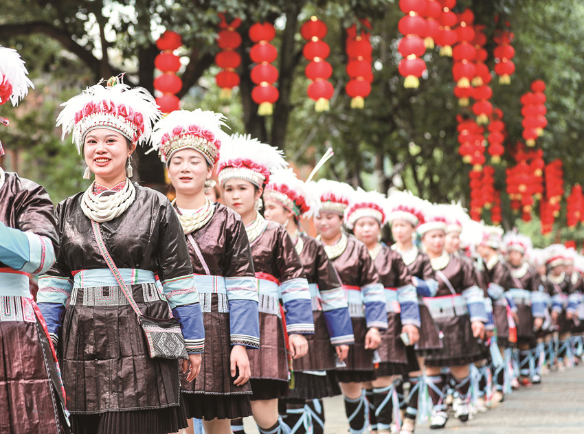 在貴州省黎平縣肇興侗寨,侗族群眾身著節(jié)日盛裝參加侗年巡游活動(dòng)。