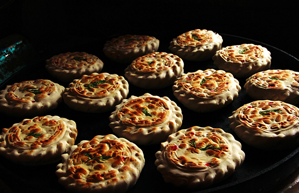 印板圖案多為三條圓圈或藏族美術(shù)中常有的萬吉祥等,圈內(nèi)雕有玉兔、鹿子、獐子吉祥物等,一般是一對玉兔相對而立,或是鹿子休閑躺于青草之上,或是兩朵鮮花對開,或是……再用手將“花饃饃”的周邊勒成各種花邊,并點上幾點食用紅點(紅點表喜慶,如年內(nèi)曾遇喪事則不點紅點)。最后將成形的“花饃饃”置于平鍋底在火上炕成即可??缓煤蟮摹盎x饃”外形呈圓形,象征圓月,“圓月”里有玉兔等吉祥圖,有象征喜慶吉祥的紅,有象征春天的綠,極為鮮麗好看而又香甜味美,叫人垂涎。但做好后不能立即實用,首先要選兩個最大最好的來敬月亮,敬菩薩,要等敬月亮,敬菩薩后,中秋這天才能吃,并伴以水果等物贈送鄰里、親朋。據(jù)說這是為了促進(jìn)友誼,讓大家品嘗大家吉祥。