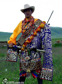 吐蕃時期   藏族服飾文化有了較大的發(fā)展。"中二丁王"時(相當于中原西漢中期),南方雅隆河谷的吐蕃開始了冶煉鐵、銅、銀等礦產(chǎn),為金屬飾品的出現(xiàn)創(chuàng)造了條件。藏史記載,公元三世紀的拉妥妥日年贊時,吐蕃贊普的服飾巳與眾不同,出現(xiàn)了服飾等級的差異。史載松贊干布時期,吐蕃的歷史翻開了新的一頁,吐蕃文化得到迅速的發(fā)展,其服飾文化日漸發(fā)達。吐蕃奴隸制王朝等級森嚴,在服飾上的表現(xiàn)也日臻完備。從反映吐蕃盛時的敦煌壁畫可看出,君臣服飾的等級差異,藏王一般只有贊普才能使用的三瓣寶冠箍住的有凹槽裝飾的無沿帽,呈紅色,通常高于一般人的帽子;藏王的侍從或臣下往往戴平頂無沿帽。衣袍的式樣也各有不同,官吏的章飾規(guī)定有一等瑟瑟,二等金,三等金包銀,四等銀,五等銅,六等鐵等大小兩類,共十二級,裝在方圓三寸的盒子里掛在胸前,以區(qū)別職位的高低。武將的頭盔有形如塔的裝飾,戰(zhàn)士頭盔上有三只彩旗以表示出生的年月,隨著"惟以淬礪為業(yè)"的吐蕃冶煉業(yè)的發(fā)展,軍隊的鎧胄日趨精良,有的周身僅露兩個眼窩,勁弓利刃常不能破,其威嚴、勇猛之氣在今天大昭寺壁畫的吐蕃武士像中尚歷歷在目。吐蕃貴族不僅本人穿著華貴,還在聚會宴客時,把傭人裝飾起來。而作為贊普的松贊干布則用一種紅帶子包頭,身著長袍,足穿腳尖朝上的靴子,據(jù)《紅史》載,這種王服是受波斯王朝的影響,反映了文化交往已影響到了服飾文化層次,而從松贊干布伊始的吐蕃與中原的密切交往,兩種民族文化的長期接觸更為藏族服飾的發(fā)展注入了新鮮血液。史載文成公主進藏時,帶入諸種花緞、錦、綾羅與諸色衣料二萬匹,還有大量的金玉器具。松贊干布及吐蕃大臣紛紛自行去掉氈裘,改穿絹綺。近代西藏的高級官吏,頭發(fā)綰成一髻,戴金翅白紗帽,這是唐代進士的服飾。此外,還采納文成公主建議,令國人禁止"赭面"(用油涂面),文成公主進藏還帶來了種植蠶桑和紡織技術,"植??椊z兮"大大的促進了吐蕃服飾技藝的發(fā)展,青海海西州都蘭出土的大批吐蕃服飾文物,真實、生動地反映了吐蕃服飾的工藝水平。服裝的織物紋樣多為聯(lián)珠動物紋,裝飾品的金質首飾、佩飾的精美使人嘆為觀止。今天藏族婦女飾品的鑲嵌形制,可以從這些文物中找到原型。斯坦因的《古代中亞文化遺跡》一書也曾提到:"在吐蕃發(fā)現(xiàn)的遺物中,有很多具有花紋的絲織物,花紋中有些是印的,有些是織的,花紋圖象的變化很多,這一點很可以表示吐蕃商業(yè)的地位,……大概是中國與西亞之間的貿易重點。"頻繁的交往促進了吐蕃經(jīng)濟的發(fā)展,也促進了服飾文化的發(fā)展。 吐蕃是一個軍事帝國,在它的發(fā)展過程中征服融合了青藏高原及其邊緣地區(qū)的許多其他民族,這是造成今天各地區(qū)藏族之間文化差異的重要原因。在服飾的表現(xiàn)上也是如此。吐蕃時代這種差異主要表現(xiàn)為東女、附國、黨項等部落服飾的不同,東女部落住在康延川(今昌都),處于母系氏族社會發(fā)展階段,其女王穿青毛綾(氆氌)裙,上披青袍,袖長到地,冬穿用文錦裝飾的羔裘。發(fā)作鬟髻狀,兩耳垂珰(耳環(huán))。足穿革素(皮靴)。一般男子披發(fā),婦女辨發(fā),男女都用彩色涂面。王死居喪三年,不易服,不梳洗。附國是以今四川甘孜為中心,包括今四川阿壩一帶的嘉絨藏人的藏羌融合體。他們頭戴圓形皮帽,或帶幕離佳(即面罩一類飾物,為婦女所帶)。身披毛曷毛(氆氌一類)、皮裘,穿牛皮鞋。頸系鐵索,手貫鐵釧。王與酋長以金為首飾,胸前掛著三寸長的金花。黨項則是純游牧部落,"服氈襲褐,披氈以為上飾",早在北周時巳能制造精美的犀甲、鐵鎧。四川西北部還有屬黨項部落聯(lián)盟的鄧至、武興國和宕昌等,服飾習俗為頭藏烏皂突騎帽,身穿長袍,下著小口褲、足穿皮靴,與今四川牧區(qū)藏族服飾相似。此外青海地區(qū)有吐谷渾,貴婦人披錦袍,戴金花冠。如女發(fā)型為辨發(fā)披于后,后飾珠貝,以繁多為高貴,這一服飾與今青海藏族婦女大致相同。這些地區(qū)服飾特征是今天各地不同藏族服飾的母型。 吐蕃王朝崩潰后,從九世紀中期到第十一世紀的二百余年間,西藏社會一直處于分裂割據(jù)的混亂狀況。這一時期戰(zhàn)亂不堪,服飾藝術的發(fā)展也難免厄運,停滯不前,而與戰(zhàn)爭有關的武士服飾卻濟時發(fā)展。在西藏阿里古格王國的遺址中,發(fā)掘有大量古代武士的盔甲和武器。其鎧甲多為鋼片甲,是用細皮條串結鋼片而成,串結方法頗為復雜,武器中的盾牌,系用藤條編織為圓形,直徑八十厘米,正面鑲有銅質加固件,銅件上雕刻有細密的紋飾,故亦可謂是銅飾件,背面有四個銅環(huán),環(huán)間可用皮條相連,作握柄之用,無論這些服飾和兵器,是西藏本地生產(chǎn),還是外來流入,都說明其時西藏的武士服飾已具鮮明的本土特征與個性。 佛教僧侶服飾興起  這一時期的服飾發(fā)展還有一個特點就是佛教僧侶服飾的興起。公元八世紀,西藏出現(xiàn)了第一批僧人,服飾由贊普府庫供給,后由百姓、政府共同供養(yǎng)。佛教服飾亦形成等級區(qū)別,并有節(jié)日與平時的不同裝束,自成體系。不少上層僧侶生活奢侈,衣著華麗,"下坐重裀,上張傘蓋,身衣錦緞……"。早期西藏僧侶服飾受印度影響甚大。據(j