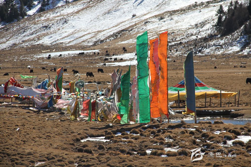 (2)涅槃旗:甘孜州道孚等地沿襲水葬風俗,即埋尸河邊或山坡上有大片涅槃旗,向著河流飄向,有讓死者在地獄里減輕痛苦,盡快得到轉世。