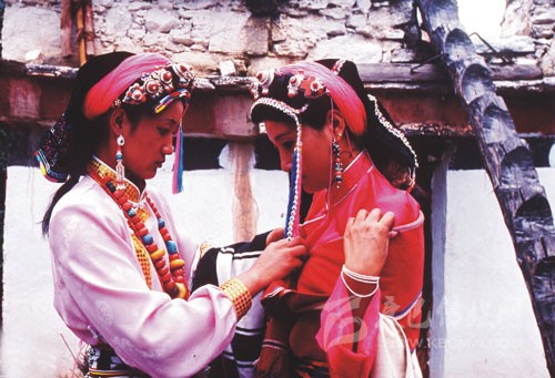 婦女一般不著褲,舉止活動隨時注意長抱下擺齊腳背,不露腿。民主改革以來,多以春秋褲、運(yùn)動褲穿于袍內(nèi)。